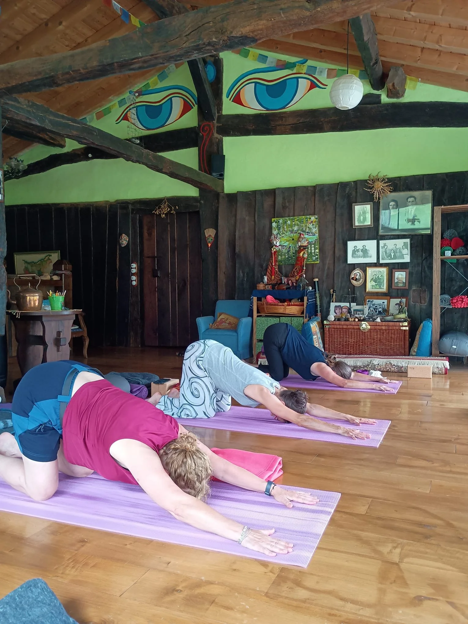 El Caserío Perunea fue construido en el siglo XVI y totalmente reformado con bioconstrucción hace 20 años, conservando las paredes de piedra y las vigas de madera originales. La sala grande es un espacio ideal para la práctica de yoga por la energía acogedora y sanadora que trasmite y por las vistas. A través de los grandes ventanales vemos las Malloas de Aralar hacia el sudoeste, y hacia el sudeste vemos la huerta, el majestuoso nogal y el monte Elosta. Escuchamos los pájaros y las ovejas y a veces los milanos nos sobrevuelan con curiosidad a ver lo que hacemos.